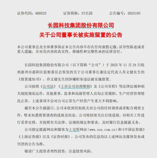 11月24日深夜,ST长园(600525.SH)发布公告称,公司董事长兼法定代表人乔文健因涉嫌职务违法,被惠州市惠阳区监察委员会实施留置。这一突发事件令本就深陷治理困境的ST长园再度蒙上阴影。
