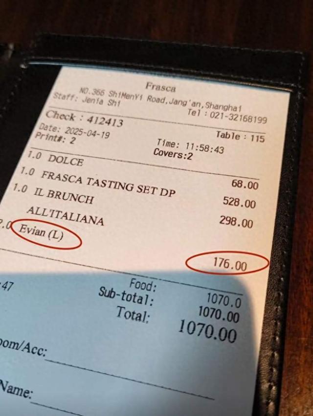 与此同时,上海静安区一家名为“Frasca”的餐厅因瓶装矿泉水收费问题,再度引发争议。12月初,网友“茉莉”与男友在该餐厅用餐时,因两瓶依云矿泉水收费176元而不满。她表示,餐厅未明确告知价格,事后投诉要求退费。