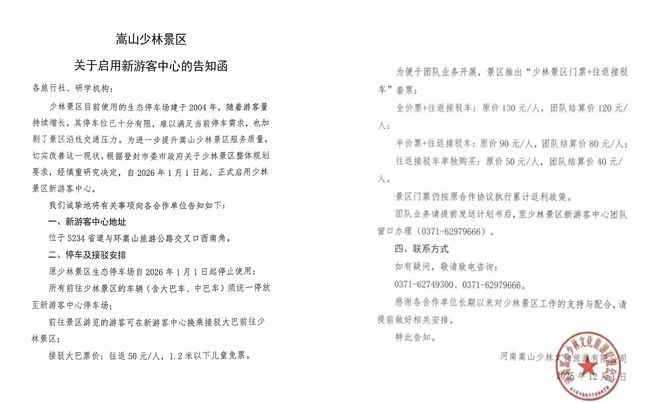 近日,河南嵩山少林景区一则关于启用新游客中心的通知在网络上引发广泛关注。通知显示,自2026年1月1日起,所有社会车辆需统一停放至新游客中心停车场,再转乘往返50元的接驳车进入核心景区。这一安排尚未正式实施,却已在游客群体中激起不小的讨论声浪。