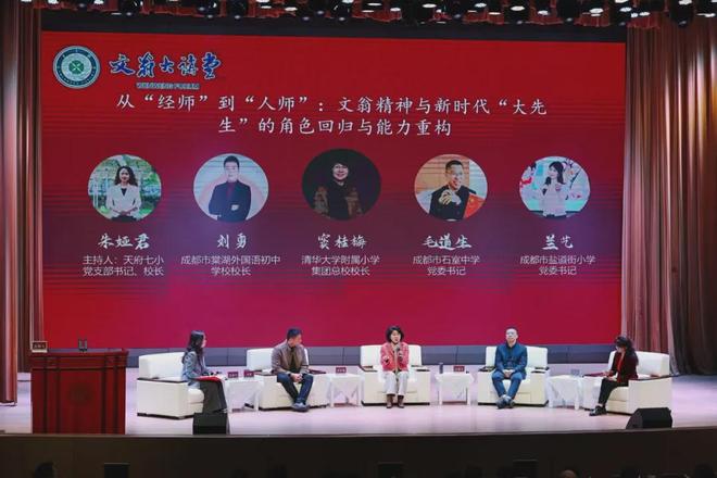 本次主题沙龙以“从‘经师’到‘人师’:文翁精神与新时代‘大先生’的角色回归与能力重构”为主题,由四川天府新区第七小学党支部书记、校长朱娅君主持,特邀窦桂梅校长、成都石室中学党委书记毛道生、成都市棠湖外国语初中校长刘勇、成都市盐道街小学党委书记兰艺参与。沙龙围绕文翁作为“大先生”超越“经师”成为“人师”的核心标志、其对教育家精神的启示,以及当前教师从“经师”向“人师”回归过程中所面临的现实冲突与认知偏差等问题展开深入交流。讨论中,毛道生强调文翁“以文化人”的实践与仁心是推动社会教化的关键;刘勇提出“把教书留给AI,把育人还给教师”,点明教师在育人方面的不可替代性;兰艺指出“理解力”是教育之本;窦桂梅则通过具体案例,引发对教师价值判断、理解儿童和跨学科整合能力等专业素养的思考。
