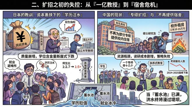 二、扩招之初的失控:从“一亿教授”到“宿舍危机”1、日本的教训:资本裹挟下的“学历注水”